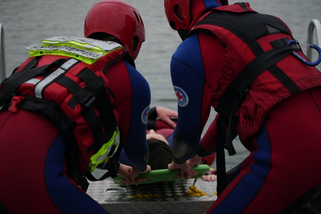 Wir nutzen die ruhigen ersten Wachtage für Wasserrettertrainings, um unser Wissen aufzufrischen und zu festigen.